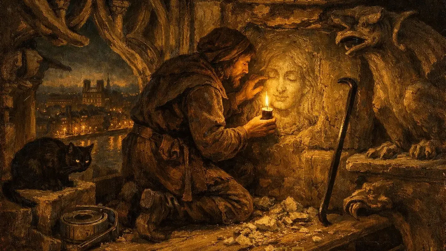 Жиль посмотрел на рисунок. Потом — вниз, на город. Сена блестела. Лодки ползли по ней — медленные, плоские, гружёные. Где-то там, внизу, на площади, она плясала. С козочкой. С бубном. А он смотрел сверху. Отсюда. С этого карниза. И вырезал её лицо на камне. На внутренней стороне блока — там, где никто не увидит.