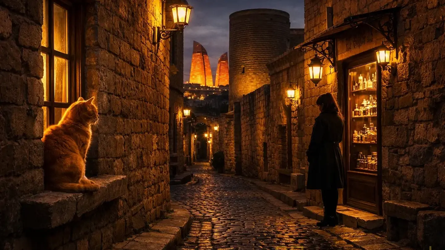 Они шли по Ичери-шехер. Узкие улочки — камень, камень, камень; стены выщерблены веками, фонари желтые, тусклые, как воспоминания. Кошка — рыжая, наглая, бакинская — перебежала дорогу и уселась на подоконнике. Посмотрела на них с выражением: ваши проблемы меня не касаются. Правильная кошка.