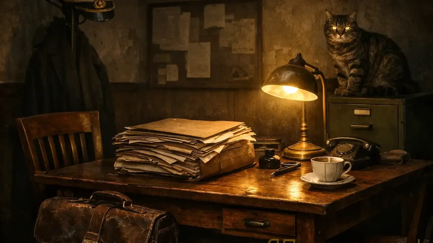 Нарезка: чёрно-белые фото 1930-х, контора, мемные вставки, закадровый голос, драматичная музыка. Финальный кадр — человек в белой фуражке уходит по набережной с чемоданом.