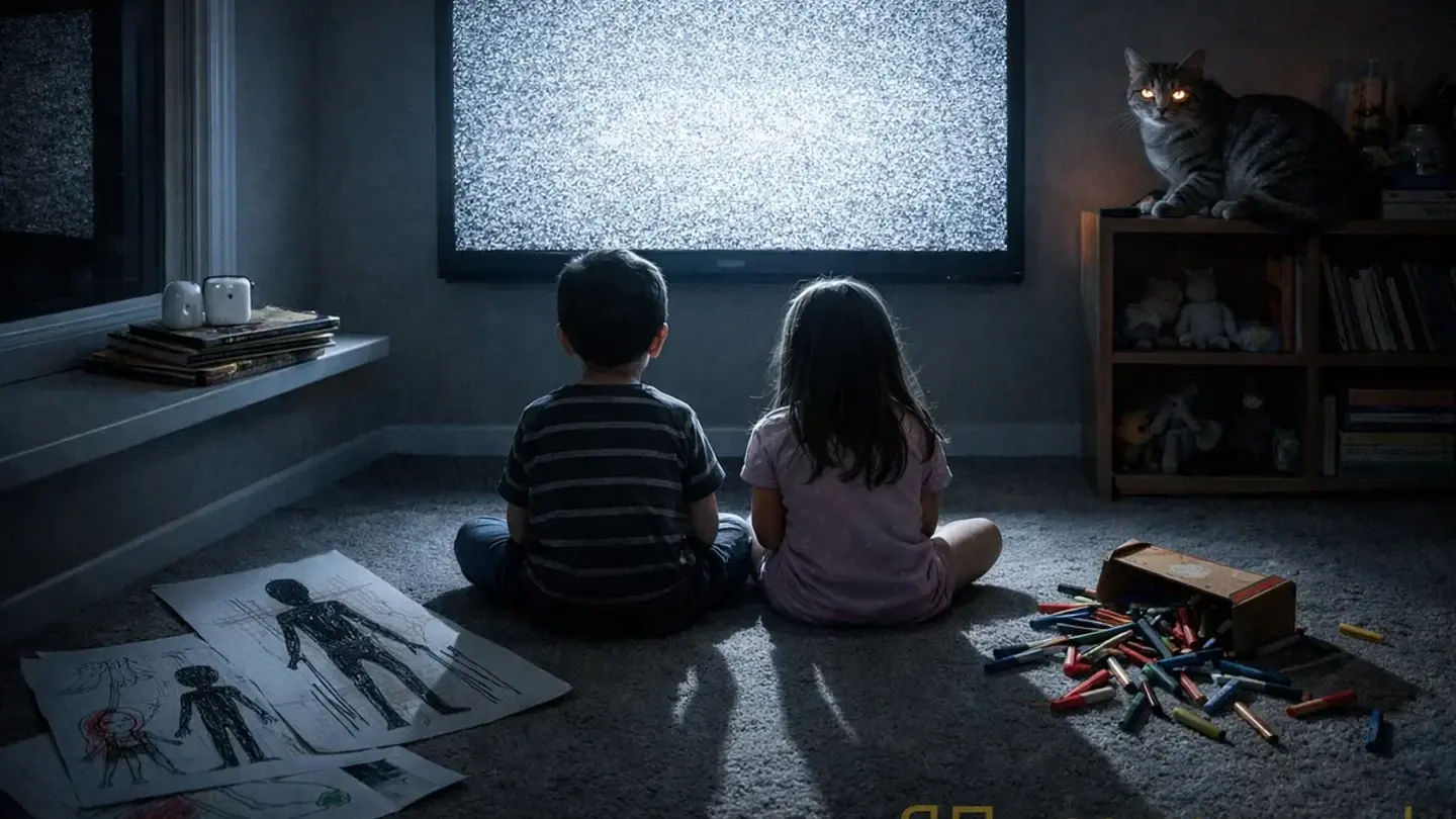 Дети сидят перед экраном. Не двигаются. Не моргают. Лица — бледные пятна в сером свете. Глаза открыты. Широко.