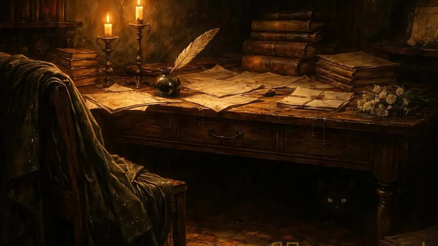 И я дал мальчишке пятак, и не жалел уже ни о поездке, ни о семи рублях, мною истраченных...","continuation_style":"faithful","keywords":["Станционный смотритель","Пушкин","Повести Белкина","продолжение классики","русская проза","покаяние"],"image_prompt":"Cinematic 16:9 landscape composition, 19th century oil painting style with warm candlelight illumination, dramatic chiaroscuro, deep shadows, volumetric dust, muted ochre dark brown and golden palette. In an old writer study: old wooden desk, scattered manuscripts with no readable text, antique books, ink bottle, quill pen, candle holders. A damp travel cloak lies over a chair, droplets on the floor, and a child wildflower bouquet rests beside a closed letter. Hide two cats in shadows: one under