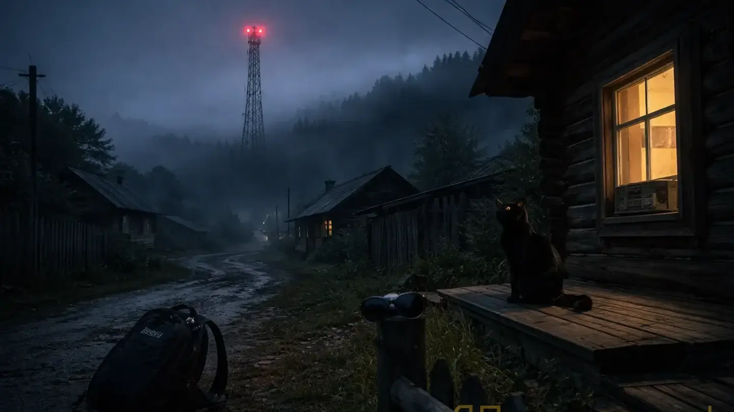 В два — встал, подошёл к окну. Деревня спала. Ни огня. Ни движения. Двадцать семь домов стояли тёмные, одинаковые, как нарисованные. На холме мигала вышка — ритмично, спокойно.